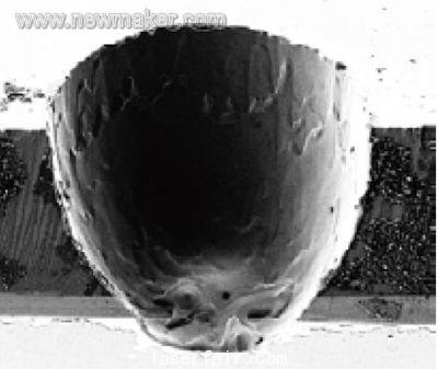 有時也會(hui) 用到盲孔。這種要求實現一個(ge) 平滑的內(nei) 部輪廓。圖5是用20W脈衝(chong) 激光器在矽片上鑽出的一個(ge) 盲孔。