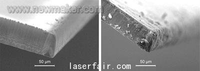 圖1:利用飛秒激光器在高掃描速度下切割晶圓,切割效果因掃描速度的不同而不同。左、右兩(liang) 張圖分別是以4m/s和80mm/s的掃描速度切割晶圓的效果圖,很顯然,掃描速度越高,切割效果越好。
