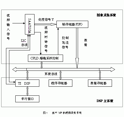 一般的視頻信號采集係統一般由視頻信號經箝位放大、同步信號分離、亮度/色度信號分離和A/D變換等部分組成,采樣數據按照一定的時序和總線要求,輸出到數據總線上,從(cong) 而完成視頻信號的解碼,圖中的存儲(chu) 器作為(wei) 幀采樣緩衝(chong) 存儲(chu) 器,可以適應不同總線、輸出格式和時序要求的總線接口。