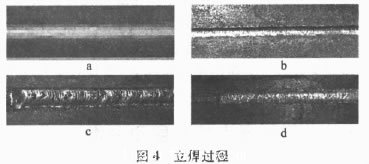 a. 在早期試驗中,電流、電壓值與(yu) 焊速的匹配總不令人滿意。采用的MIG脈衝(chong) 焊,其宜於(yu) 用較小的平均電流進行焊接,特點是熔池體(ti) 積小,不易淌流,且在脈衝(chong) 峰值電流作用下,熔滴的軸向性好,故比起普通氬弧焊更有利於(yu) 焊縫成形,在全位置焊中有很好的效果。試驗中早期打底焊焊速一般在8cm/min以上,相應電流值也較高,在95-105A之間,焊接過程不太穩定,背麵成形有時也不理想。究其原因,在於(yu) 脈衝(chong) 幅值的影響,脈衝(chong) 電流使熔滴呈噴射過渡,在較大脈衝(chong) 電流下較小的電壓易造成大飛濺、淌流,而大電壓表麵成形也不理想。我們(men) 在試驗中不斷摸索,後在穩定幅值的前提下適當減小電流、電壓並且降低焊速,這樣在橫向和垂直位置的焊接過程中,充分發揮出了脈衝(chong) 焊工藝在全位置焊上的優(you) 點,焊接過程穩定,飛濺小,兩(liang) 麵成形都很理想。圖4a、圖4b、圖4c、圖4d 依次為(wei) 立焊焊前加襯墊樣板、立焊背麵成形、打底和蓋麵成形樣例。