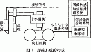 爬行式弧焊機器人係統的構成主要由永磁履帶爬行機構、激光圖像傳(chuan) 感係統、信息處理及跟蹤控製係統所組成,如圖1 所示。爬行機構是機器人的運動動力係統;圖像傳(chuan) 感與(yu) 信息處理係統構成焊接識別係統,以識別焊縫,與(yu) 跟蹤控製係統一起組成焊縫跟蹤係統,以實現運動中的焊縫跟蹤和焊接。