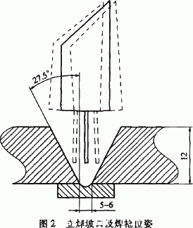 立焊打底時焊槍垂直於(yu) 工件mm 左右上方,加擺後焊絲(si) 靠兩(liang) 邊坡口1-2mm,如圖2所示。第二道蓋麵,焊槍垂直上調5-8mm,擺動幅度適當調大。立焊時各參數如表1所示。