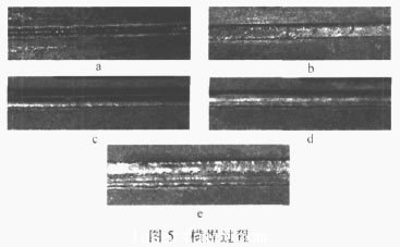 b. 手工焊蓋麵橫焊工藝采用的是加擺停留的方法,由於(yu) 人工操作的靈活性,焊接過程中擺動頻率、幅度和停留時間均可實時改變,故一般寬度的蓋麵焊可一次成形。由於(yu) 該機器人缺乏人的靈活性,我們(men) 通過模仿人工的蓋麵過程橫焊,采用高焊速加快速擺動或不加擺動多道成形的橫焊蓋麵方法。這樣就避免了橫焊蓋麵淌流的發生,也取得了不錯的效果。圖5a、圖5b、圖5c、圖5d、圖5e 依次為(wei) 橫焊背麵成形、打底焊、蓋麵第一道、第二道、最後蓋麵成形。