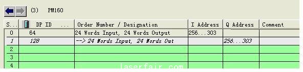 推動需要的輸入輸出數據塊到網關(guan) 對應的槽位。如下圖所示,將數據塊“24Words Input,24Words Output”拖動到Profibus-DP從(cong) 站地址為(wei) 3的PM-160的槽位中,此時,對應的映射區地址分別為(wei) 256,PLC程序需通過PIW256(PIB256)或者PQW256(PQB256)對相應的數據進行尋址訪問。