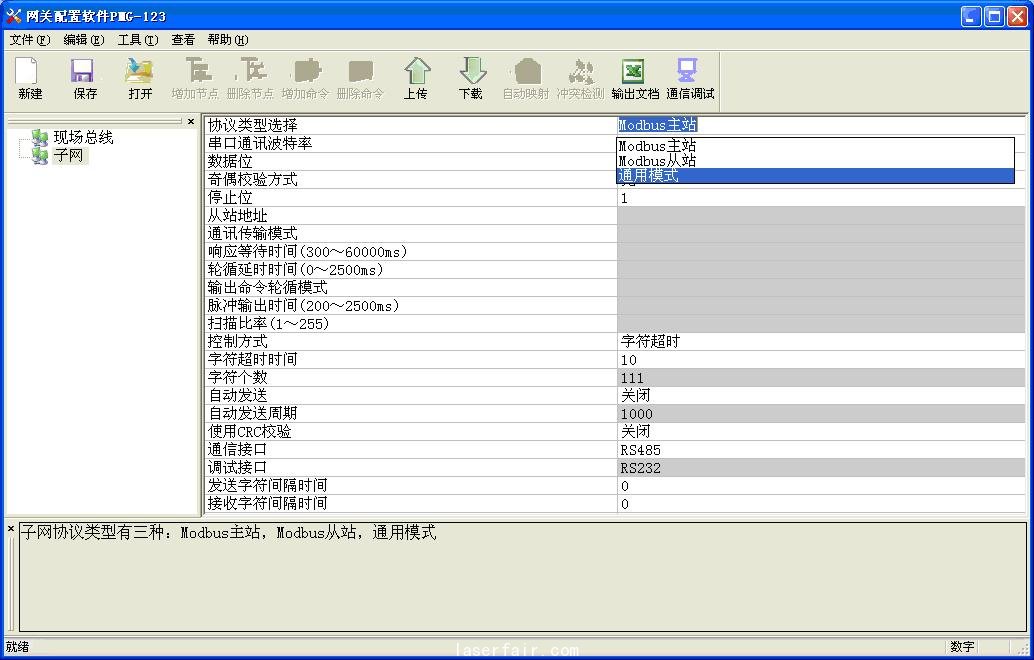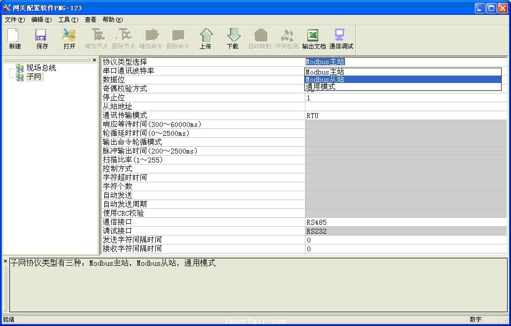 當實現PLC與(yu) Modbus設備通信時,子網協議類型設置為(wei) Modbus主站,並設置串口通信參數、通訊傳(chuan) 輸模式、通信接口等。其中,串口通信參數的設置應該和所連接的Modbus從(cong) 站設備一致: