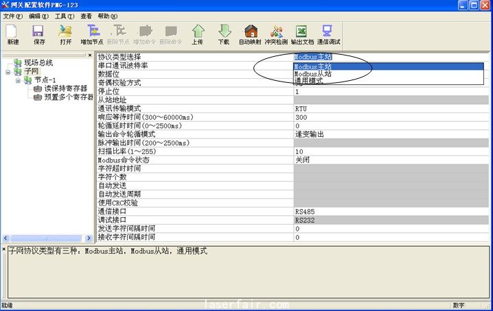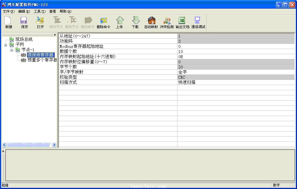其中,圖9中的“節點-1”表示連接的從(cong) 站設備地址為(wei) 1,配置了“讀保持寄存器”和“預置多個(ge) 寄存器”兩(liang) 條命令,表示網關(guan) 讀取了從(cong) 站對應地址的數據,並且能夠輸出數據到Modbus從(cong) 站設備,命令配置方法如下: