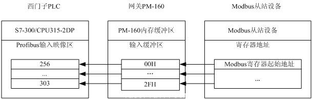 PLC通過PM-160發送Modbus主站指令讀寫(xie) 現場串口設備數據。映像區起始地址和網關(guan) 內(nei) 存映射起始地址對應關(guan) 係如下:以圖14中的配置為(wei) 例。