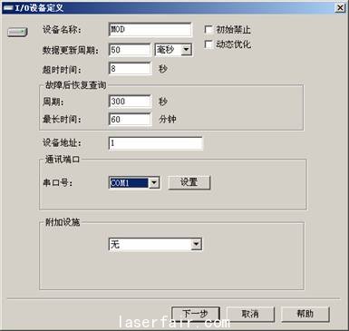 在對話框中輸入設備名稱、設備地址(與(yu) PLC中MBUS_INIT初始化的Addr參數一致),選擇串口號,並且設置(點擊“設置”按鈕)端口屬性,使用它與(yu) PLC中MBUS_INIT命令設置的屬性一致。點擊“下一步”: