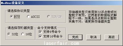 在Modbus設備定義(yi) 對話框中將協議類型選擇為(wei) “RTU”,存貯器類型選擇“32位”(即長整和浮點型4字節的數據的傳(chuan) 送格式為(wei) 高位在前,低位在後)。單擊“完成”按鈕,則設備組態完成。