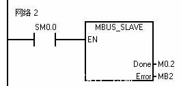 初始化完成後,就可以調用Modbus從(cong) 機通訊命令(MBUS_SLAVE)了。通常Modbus從(cong) 機通訊命令在主程序塊的每個(ge) 執行周期都要初執行(始終保持通訊狀態),因為(wei) 可以用一個(ge) 常開量作為(wei) 命令的觸發條件,如:SM0.0。從(cong) 導航樹“指令/庫/ Modbus Protocol”下麵,將MBUS_SLAVE指令拖拽到主程序塊中。調用過程如下圖所示: