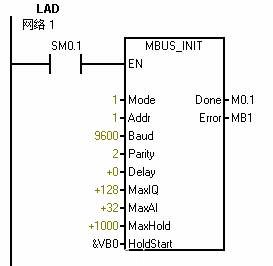 首先為(wei) MBUS_INIT命令建立一個(ge) 觸發條件(隻觸發一次),如:SM0.1;從(cong) 導航樹“指令/庫/ Modbus Protocol”下麵,將MBUS_INIT指令拖拽到主程序塊中。再就是正確設置MBUS_INIT各項調用參數和執行結果輸出地址,我們(men) 可以建立一下如下圖所示初始化調用過程: