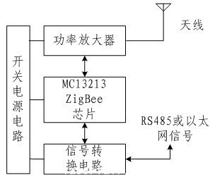 ZigBee無線通信模塊主要由開關(guan) 電源部分、ZigBee無線傳(chuan) 輸部分及接口轉換部分組成,其原理框圖如圖2所示。