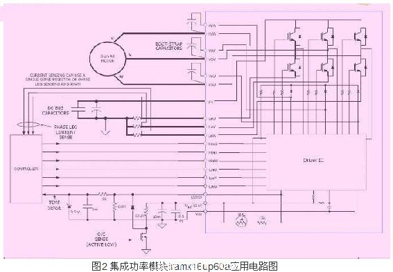 IRMCK201提供了芯片提供三組SVPWM輸出,通過光電隔離,可以與(yu) IGBT模塊或功率MOSFET的驅動電路連接。目前集成三相橋式 IGBT模塊很多,IR公司也提供了幾種規格的集成功率模塊,如iramx16up60a模塊,包含6個(ge) NPT IGBT 芯片, 每一個(ge) 都有自己的分立柵級電阻, 6個(ge) 整流二極管, 1個(ge) 三相單片集成IC, 1個(ge) 柵極驅動芯片, 3個(ge) 具有限流電阻器和一對過溫保護的NTC熱敏電阻/電阻的陰極負載二極管,因而可以大大簡化功率驅動電路的設計。圖2為(wei) 該模塊的典型應用圖。