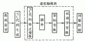 (1)工作原理及流程圖 本虛擬軸機床以兼容普通加工中心的加工能力為(wei) 主要目標之一,因而在數控加工程序編製上遵循使用傳(chuan) 統的NC代碼指令,以便於(yu) 編程和程序的移植與(yu) 交流。然而由於(yu) 機床結構的根本不同使得與(yu) 傳(chuan) 統機床直接控製X、Y、Z軸不同,在三杆虛擬軸機床上不能從(cong) NC代碼直接到伺服控製,要實現一定刀具位姿,必須轉換為(wei) 控製空間時刻變動的運動副的長度或轉角,這裏麵就必須包含NC代碼格式變換、插補、坐標變換及運動學變換等。這些就構成了虛擬軸機床數控軟件不同於(yu) 傳(chuan) 統機床的虛擬軸模塊。軟件流程圖見圖3。
