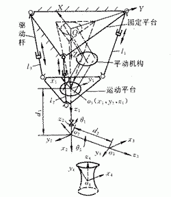 DSX5-70型三杆虛擬軸機床(圖1),由三杆並聯機構及兩(liang) 自由度串聯機構組成。兩(liang) 自由度串聯機構置於(yu) 運動平台上。通過三杆伸縮(l1、l2、l3)及兩(liang) 驅動軸旋轉(θ1、θ2)來改變刀具的位置和姿態(以o3代表刀心、o2o3代表刀具軸線),可實現五軸聯動,完成多種作業(ye) 任務。本文介紹為(wei) 它開發設計的一套基於(yu) PC的開放式數控係統。整個(ge) 數控係統軟件模塊化設計,麵向用戶,方便操作,具有良好的可擴展性及可維護性。