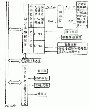 PMAC必須與(yu) PC機通訊才能完成機床的控製任務。通過PC機的外設可實現程序的輸入、編輯,參數的設置,運動狀態的實時顯示及軟件仿真等功能。利用PC機的通訊口還可使虛擬軸機床成為(wei) 柔性生產(chan) 線上的一個(ge) 製造單元。