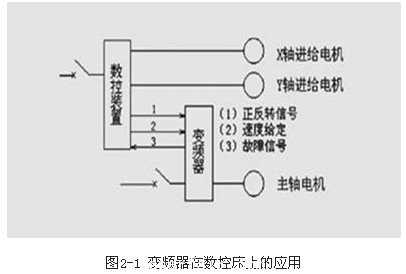 圖 2-1所示為(wei) 變頻器在數控車床的應用,其中變頻器與(yu) 數控裝置的聯係通常包括:(1)數控裝置到變頻器的正反轉信號;(2)數控裝置到變頻器的速度或頻率信號;(3)變頻器到數控裝置的故障等狀態信號。因此所有關(guan) 於(yu) 對變頻器的操作和反饋均可在數控麵板進行編程和顯示。