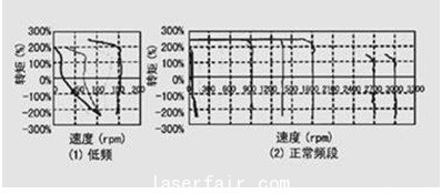 無速度傳(chuan) 感器的矢量控製變頻器不僅(jin) 改善了轉矩控製的特性,而且改善了針對各種負載變化產(chan) 生的不特定環境下的速度可控性。圖3-1所示,為(wei) 某品牌無速度傳(chuan) 感器變頻器產(chan) 品在低頻和正常頻段時的轉矩測試數據(電機為(wei) 5.5kW/4極)。從(cong) 圖中可知,其在低速範圍時同樣可以產(chan) 生強大的轉矩。在實驗中,我們(men) 同樣將2Hz的矢量變頻控製和V/F控製變頻進行比較發現,前者具有更強的輸出力矩,切削力幾乎與(yu) 正常頻段(如30Hz或50Hz)相同。