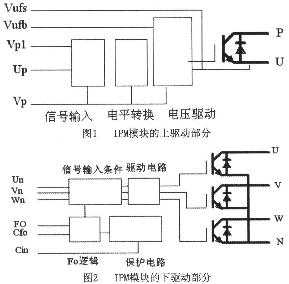 如上圖所示,圖1為(wei) IPM模塊的上驅動部分,圖2為(wei) IPM模塊的下驅動部分。一個(ge) 完整的DIP-IPM模塊包括三個(ge) 上驅動部分和一個(ge) 下驅動部分,在圖1中給出的隻是U相的驅動電路,V、W相與(yu) U相的電路完全相同。下麵就結合內(nei) 部結構對模塊進行說明。