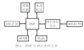 根據RTL8139的以上特點,作者設計了RTL8139與(yu) DSP之間的接口解決(jue) 方案。目前DSP與(yu) PCI的接口一般有二種方案:(1)用CPLD來實現。優(you) 點是可以進行功能優(you) 化,不必實現所有PCI協議的功能,節約係統資源。占用係統資源大的用戶可以做成ASIC,有利於(yu) 降低成本。但由於(yu) PCI協議的複雜性,短期內(nei) 還難以做到操作穩定。(2)用專(zhuan) 門的PCI橋芯片。PCI芯片功能強大,可減少開發時間和成本並能獲得較好的傳(chuan) 輸特性。目前市場上有許多PCI橋芯片產(chan) 品,最為(wei) 常見的是AMCC、PLX、CYPRESS等公司的產(chan) 品,作者選用PLX公司的PCI9054作為(wei) 本係統的PCI接口芯片。DSP與(yu) PCI接口設計方案如圖2所示。