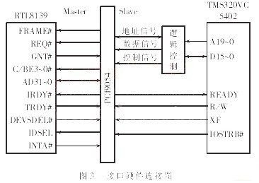 圖3中,DSP通過PCI9054來讀寫(xie) PCI內(nei) 存,地址空間由PCI的基地址開始。PCI9054作為(wei) DSP的從(cong) 設備和RTL8139的主設備。當PCI寫(xie) 時,接收寫(xie) 信號,返回ready信號直到寫(xie) FIFO滿為(wei) 止,並保持ready信號到寫(xie) FIFO可用。當PCI9054從(cong) RTL8139讀出數據時將保持ready信號,直到BALST信號(表示PCI總線上的最後傳(chuan) 輸)有效,讀周期被終止,沒有讀出的數據將被FIFO舍棄。