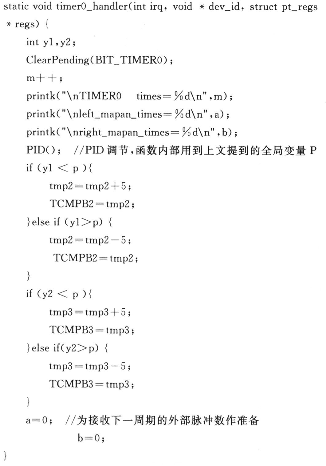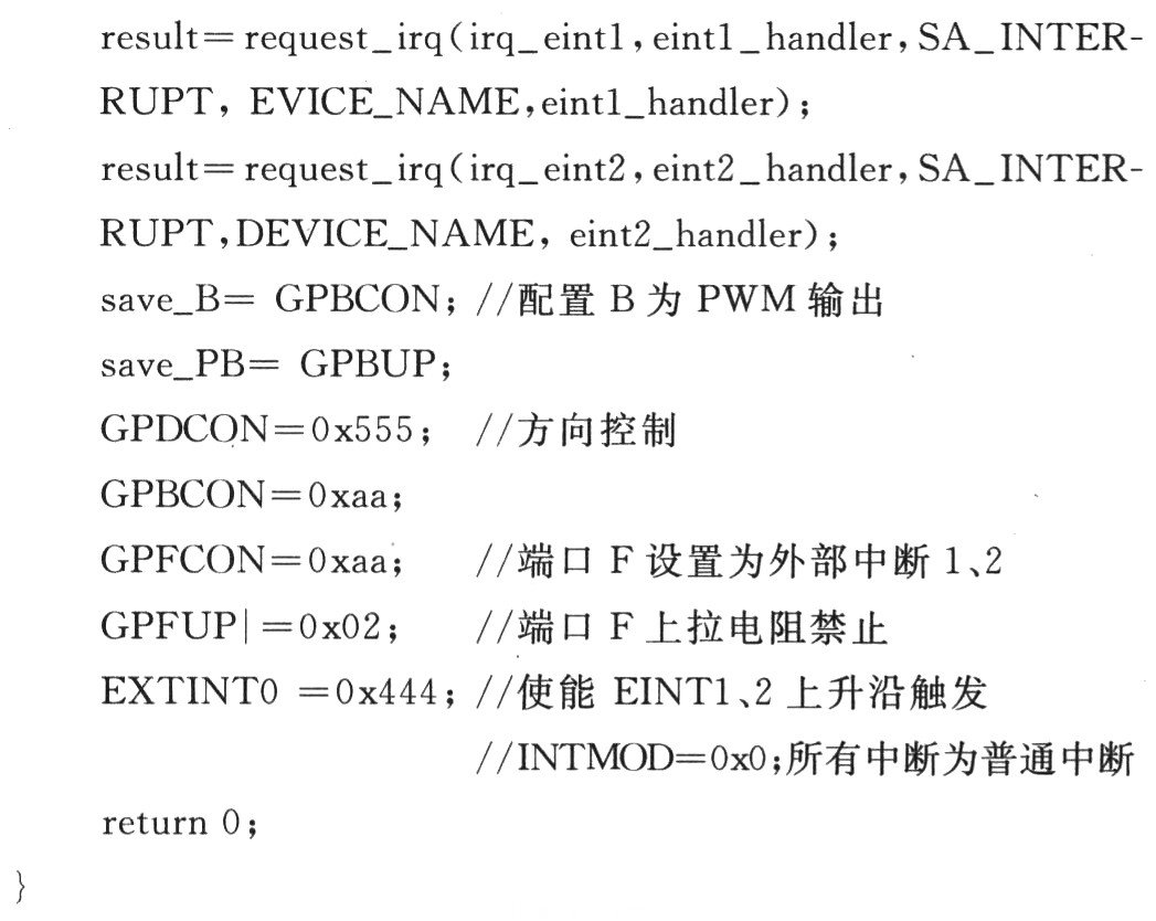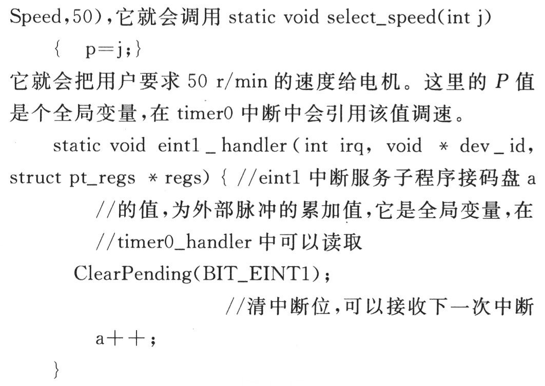 ARM沒有捕獲外部脈衝(chong) 的計數器,它的定時器是用來計算內(nei) 部脈衝(chong) 的。碼盤輸出信號接外部中斷處理程序(EINTl)並設置上沿觸發變量,在中斷中設置一全局變量i,用i++累加。設置定時器timer0,使它O.36 s產(chan) 生1次內(nei) 部定時器中斷。當一個(ge) 定時器周期完成時引發定時器中斷,在timer0中斷中讀出i的值,即得到O.36 s內(nei) 碼盤轉動所產(chan) 生的脈衝(chong) 數;接著將i清零,為(wei) 下一個(ge) 定時器周期捕獲脈衝(chong) 作準備。
