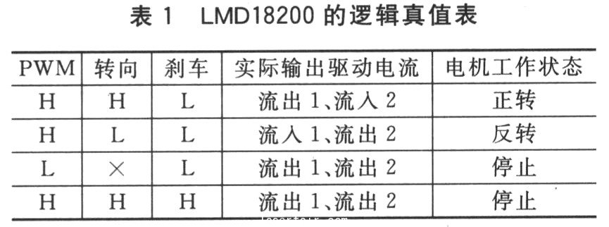 本設計采用的LMD18200的真值表如表1所列。通過ARM的I/0口(例如D口的DO~3)來控製電機的工作狀態。