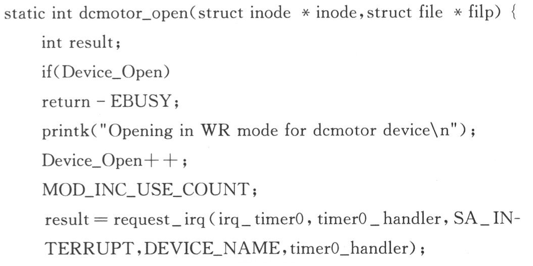 設備打開的時候就會(hui) 調用dcmotor__open函數進行申請中斷號。帶內(nei) 存管理的單元的地址映射,設置B端口的2、3引腳為(wei) PWM輸出,端口D配置為(wei) 電機使能刹車製動引腳。