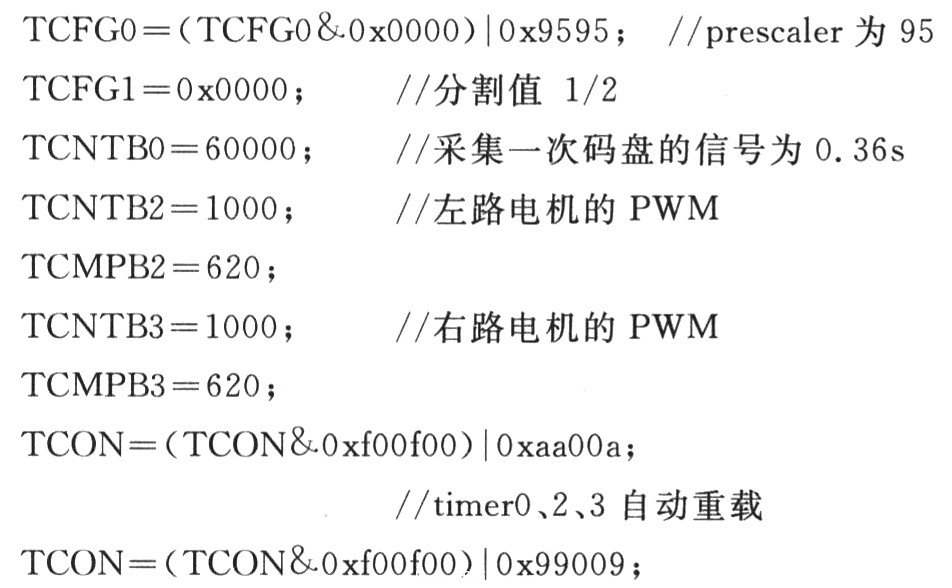 以下所有的函數都是在ioctl()中實現的。在Dcmo-tor_STart裏調用timer0_2_3_start(),設置timer0為(wei) 接收兩(liang) 路電機的碼盤信號,並檢測電機速度;timer2、timer3提供2路PWM輸出,並設置定時器自動重載。具體(ti) 實現如下:
