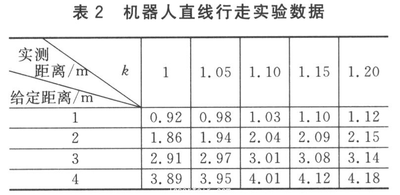 智能機器人選用的光碼盤精度為(wei) 256線,即256脈衝(chong) /轉。電機減速比為(wei) 1:71,車輪半徑R為(wei) 6 CM,車輪間距為(wei) 41.1 cm.車輪轉一圈所產(chan) 生的脈衝(chong) 數n=71×256=18 176,可以得到每個(ge) 脈衝(chong) 之間的距離d=27πR/n=2×3.14×0.06/18 176=0.207×10-4m,即每個(ge) 脈衝(chong) 對應的控製精度達0.02 mm.考慮到負載變化的影響,理論值與(yu) 實際值會(hui) 出現誤差,因此在控製精度d前乘以一個(ge) 修正係數k.表2為(wei) 機器人直線行走的實驗數據。可以看出,k為(wei) 1.10誤差較小,最接近真實值,因此該值就是所需的比例係數。
