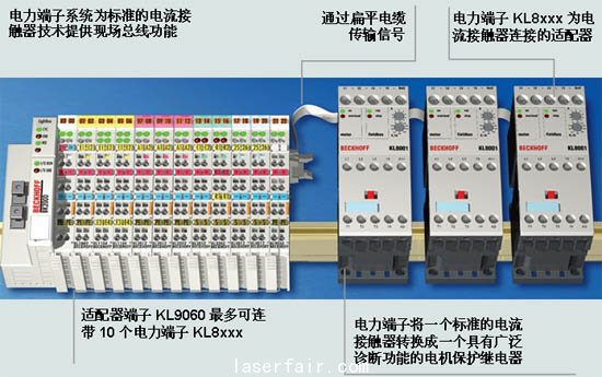KL8001 電力端子, 和動力電流接觸器一起組成了一個(ge) 完整的分布式電機起動器,可連接“任何一種”現場總線