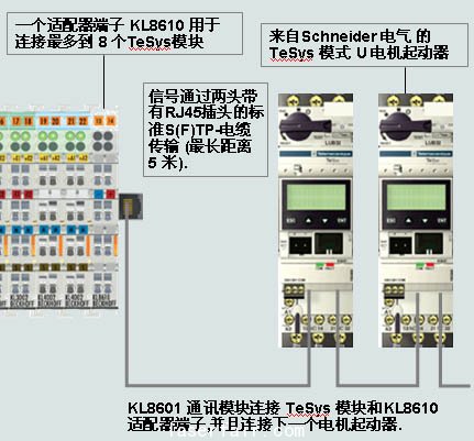 KL8601 通訊模塊連接 TeSys 模塊到總線端子係統, 因此使得它們(men) 現場總線能力適合所有通用係統