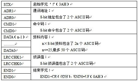 ascⅱ模式采用lrc(longitudinal redundancy check)偵(zhen) 誤值。lrc偵(zhen) 誤值是將adr1至最後一個(ge) 資料內(nei) 容加總,得到之結果以256為(wei) 單位,超出部分去除(例如得到結果為(wei) 1f2h時則隻取f2h),然後計算二次反補後得到的結果即為(wei) lrc偵(zhen) 誤值。