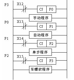 手動、自動、單步、車螺紋程序的選擇采用跳轉指令實現。圖3是總程序結構框圖。若合上X12(X13、X14、X15斷開),其常閉斷開,執行手動程序;若X12斷開,X13全上,程序跳過手動程序,指針到P0處,執行自動程序。