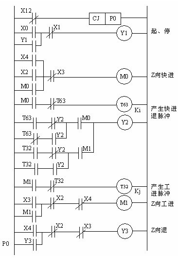 在執行手動程序狀態下,按X0,Y1接通,作好起動準備。按X2,輔助繼電器M0接通。通過T63計時及Y2觸點組合,產(chan) 生頻率為(wei) 103/2i的脈衝(chong) 信號(i為(wei) 計時時間,根據需要設定,單位為(wei) ms),驅動Z向快進。當按下X3時(M0斷開),M1接通,M1與(yu) 定時器T32組合使Y2產(chan) 生頻率為(wei) 103/2j的脈衝(chong) (j》i),由Y2輸出,實現工進。按下X4時,M0、Y3同時接通,電機快速反轉,實現快退。限於(yu) 篇幅,其它程序梯形圖略。[2]