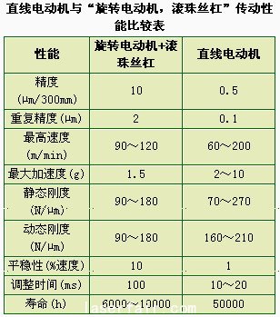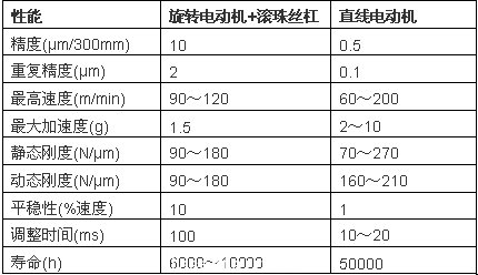 直線電動機與(yu) “旋轉電動機,滾珠絲(si) 杠”傳(chuan) 動性能比較表