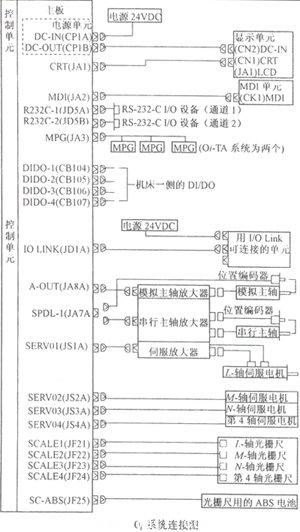 0i係統的連接圖如下圖,0係統和其他係統與(yu) 此類似。圖中,係統輸入電壓為(wei) DC42 V±10%,約7A。伺服和主軸電動機為(wei) AC200V(不是 220V)輸入。這兩(liang) 個(ge) 電源的通電及斷電順序是有要求的,不滿足要求會(hui) 出現報警或損壞驅動放大器。原則是要保證通電和斷電都在CNC的控製之下。具體(ti) 時序請見“連接說明書(shu) (硬件)”。