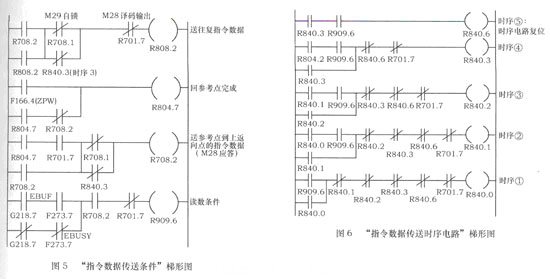 根據PMC軸的控製要求,我們(men) 設計了指令數據傳(chuan) 送圖(見圖4)、“指令數據傳(chuan) 送條件”梯形圖(見圖5)、“指令數據傳(chuan) 送時序電路”梯形圖(見圖6)和“指令數據傳(chuan) 送”梯形圖(略)。