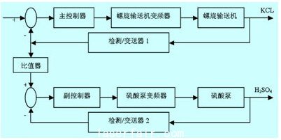 氯化鉀與(yu) 硫酸流量比值控製係統是由三菱fx2nc係列plc、耐腐蝕泵、西門子mm440變頻器、計量螺旋、電磁流量計等組成。流量比值控製係統方框圖如圖2所示。