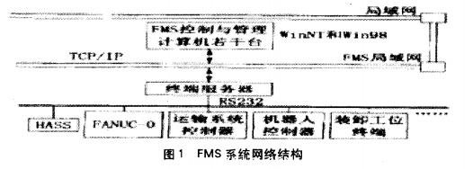 (1)物理層:是指用來執行這種通信的硬件,包括數據線和控製線本係統中采用RS232串口,機器人一端為(wei) 9針D形接頭,另一端RJ-45接頭連到了終端服務器TerminalServer擴展的串行接口上,然後通過終端服務器的網絡接口與(yu) FMS局域網相連、最終實現與(yu) 機器人控製算機的連接。硬件平台如圖1。