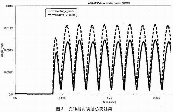 以隨動係統複現相對慣性空間穩定的輸入為(wei) 例,為(wei) 進一步比較兩(liang) 種方案,我們(men) 利用ADAMs軟件和MATLAB軟件一起進行了位標器運動學、動『J學和控製係統聯合仿真。仿真條件假設目標在空間靜止,在中環通道,分別利用陀螺速度反饋和測速機速度反饋,在彈體(ti) 擺動情況下,進行目標指示信息的隨動,對指向誤差(即光軸與(yu) 視線的夾角)的大小進行記錄,仿真結果如圖3所示。#p#分頁標題#e#
