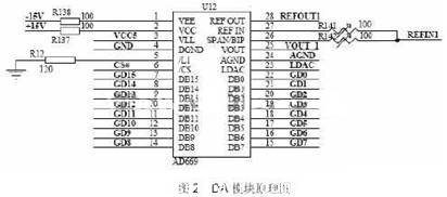 數模轉換模塊將DSP處理完的數字信號轉換為(wei) 模擬信號以控製兩(liang) 路振鏡的偏轉。由於(yu) 現在對標記精度的要求越來越高,傳(chuan) 統的8位數模轉換器已無法滿足用戶的需求,因此本係統選用ADI公司的16位高精度數模轉換器AD669芯片,如圖2所示。AD669為(wei) 16位並行輸入,二級數據緩存結構。設計中將/L1信號直接接地設置為(wei) 有效,通過控製/CS和LDAC信號分別控製一級緩存和二級緩存。控製振鏡信號的電壓範圍為(wei) -10V~+10V,以標記 100mm×100mm幅麵大小的標牌為(wei) 例,精度可達100mm/216=0.0015mm,對應最小輸出電壓為(wei) 0.00031V。