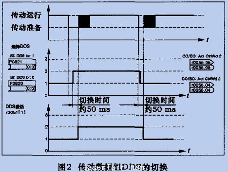 用於(yu) 控製傳(chuan) 動係統和輸入給定值的參數(連接器和開關(guan) 量連接器輸入)分配給命令數據組(CDS)。控製命令和給定值的信號源用BICO技術互連。傳(chuan) 動數據組用BICO參數P0820和P0821來切換。激活的傳(chuan) 動數據組顯示在參數r0051中。傳(chuan) 動數據組可在“準備”狀態下切換,此項切換約需 50 ms。如圖2所示。