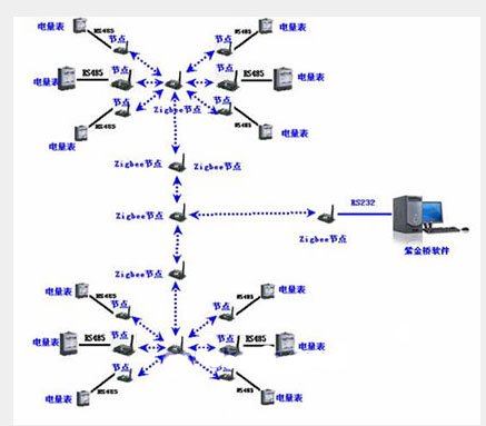 考慮到無限傳(chuan) 輸的穿透能力,在每個(ge) 樓層布置一個(ge) 主節點作為(wei) 整個(ge) 網絡的傳(chuan) 輸主幹線,在監控中心布置根節點作為(wei) 整個(ge) 網絡的維護中心,每個(ge) 電能表都通過RS232/485連接到一個(ge) 從(cong) 節點上。