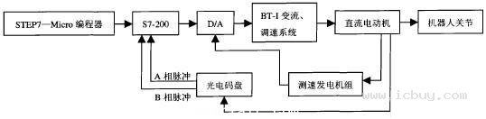 係統采用SIEMENS7-200型PLC,外加D/A數模轉換模塊,將PLC數字信號變成模擬信號,通過BT―I變流調速係統(主要由轉速調節器ASR、電流調節器ACR、環流調節器ARR,正組觸發器GTD、反組觸發器GTS、電流反饋器TCV組成)驅動直流電機運轉,驅動機器人關(guan) 節按控製要求進行動作。係統結構如圖1所示。