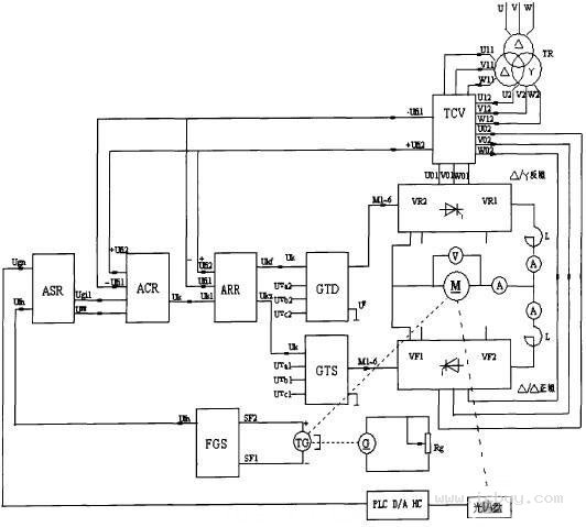 控製電路主要由轉速調節器ASR、電流調節器ACR、環流調節器ARR,正組觸發器GTD、反組觸發器GTS、電流反饋器TCV組成(見圖2),其中2組觸發器的同步信號分別取自與(yu) 整流變壓器相對應的同步變壓器。
