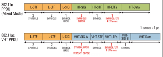 圖2. 802.11n 與(yu) 802.11ac的幀結構的對比