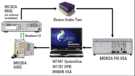 另一個(ge) 測量挑戰出現在測量數字預失真(DPD),為(wei) 了改善失真,需要產(chan) 生和測量占用帶寬高出3-5倍帶寬範圍內(nei) 的功率放大器的線性特征。安捷倫(lun) SystemVue W1716 DPD Builder軟件能夠提供一個(ge) 自動數字線性失真設計測試應用。該軟件產(chan) 生一個(ge) 激勵波形,下載到信號源,信號源產(chan) 生的信號通過功率放大器後使用信號分析儀(yi) 接受放大後的信號,並將信號解調出來,傳(chuan) 輸給測試電腦,軟件通過對比激勵波形和接收到的波形判斷失真情況,從(cong) 而達到測量和分析功能。如下圖: