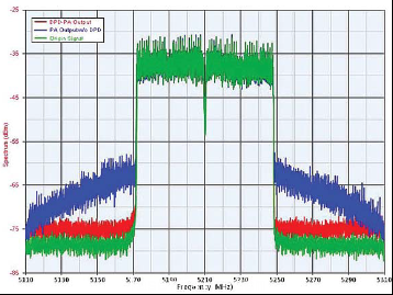 圖4顯示了一個(ge) 802.11ac 80MHz信號經過預失真的實例。綠色波形是發射的激勵信號,藍色波形是沒有經過預失真處理的從(cong) 功放輸出的信號,而紅色波形是經過預失真的結果。