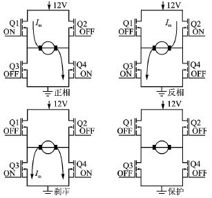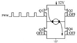 驅動有刷直流電機的雙向旋轉,可通過全橋驅動電路改變電流來實現完成,如圖2所示。這個(ge) 全橋驅動電路由N通道的MOSFET管組成,當Q2和Q3關(guan) 閉的時候,Q1和Q4導通電機正相旋轉;當Q1和Q4關(guan) 閉時,Q2和Q3導通電機反相旋轉。